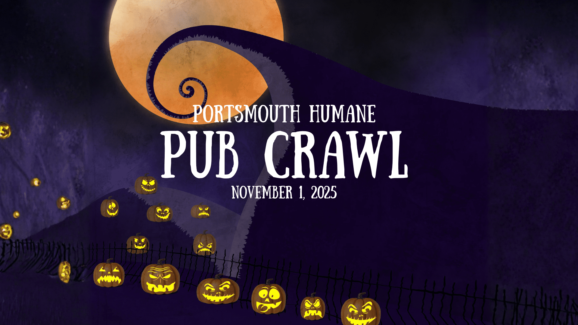 What’s this? What’s this? The 2025 Portsmouth Humane Pub Crawl! Raise a glass – and lifesaving funds for the animals! On Saturday, November 1st, 2025 – join us for a spooktacular good time. From 5 pm to 9 pm, we’ll don our spooky-best and turn High Street into Halloween Town!